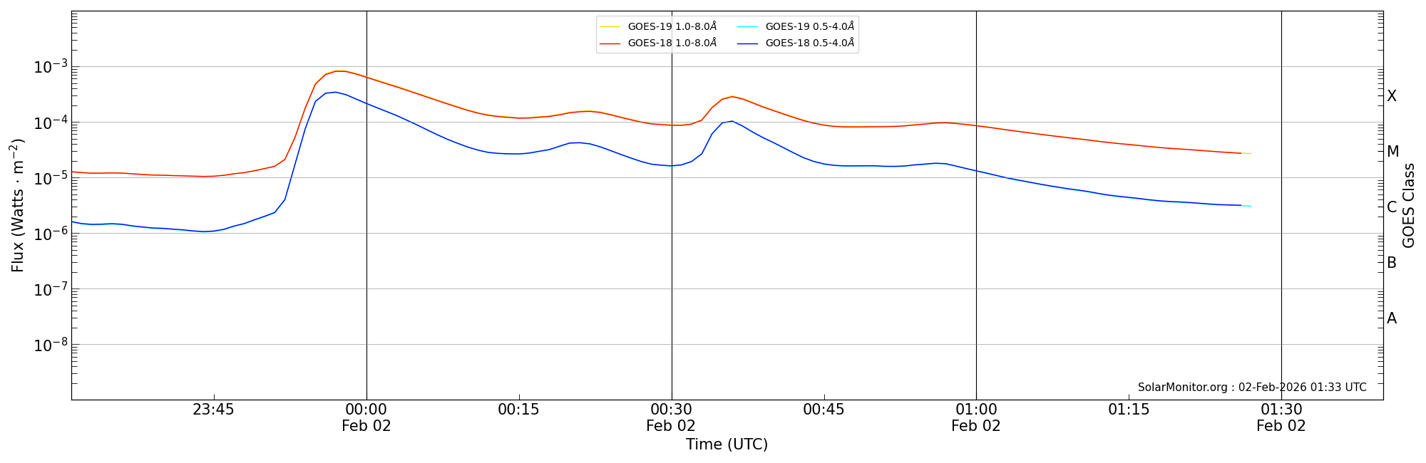 | 2026-02-02T00:31:00 | 00:36:00 | 00:40:00 | 13, -34 | 14366 | X2.8 | HEK : SSW Latest Events |