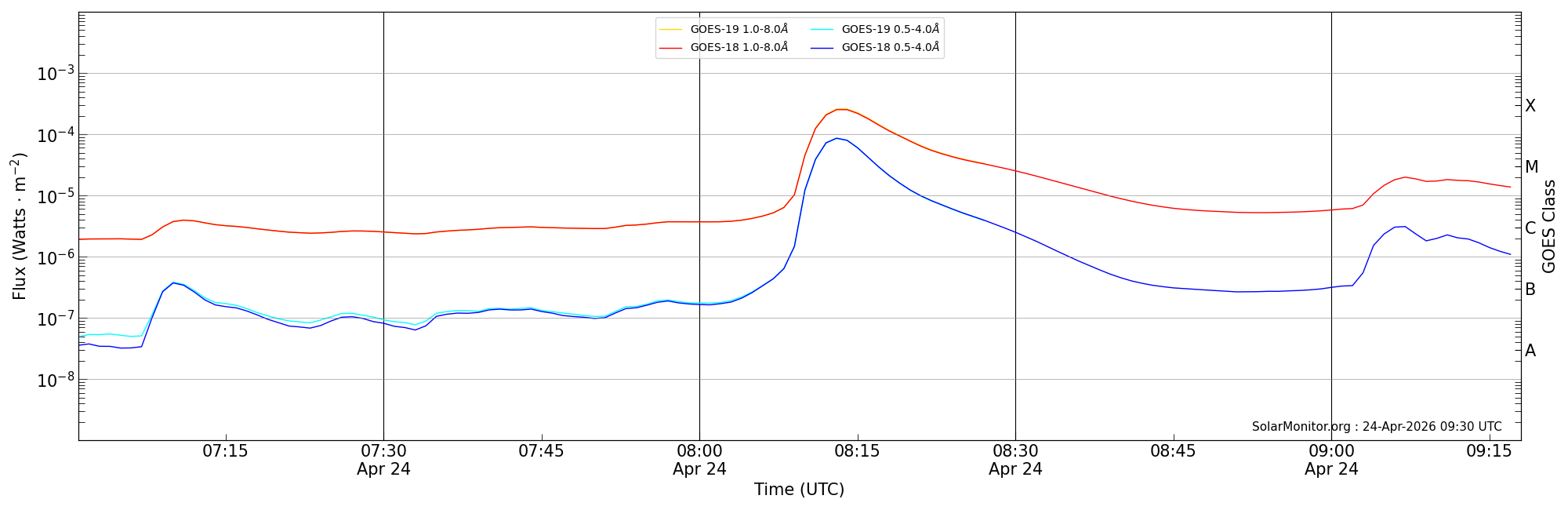 | 2026-04-24T08:01:00 | 08:13:00 | 08:18:00 | 16, 72 | 14419 | X2.5 | HEK : SSW Latest Events |