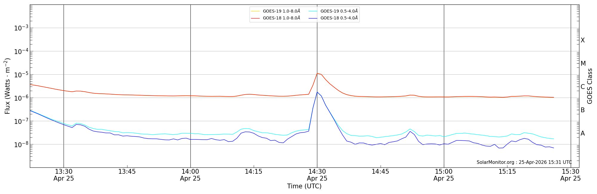| 2026-04-25T14:22:00 | 14:30:00 | 14:32:00 | 7, -74 | 14425 | M1.1 | HEK : SSW Latest Events |