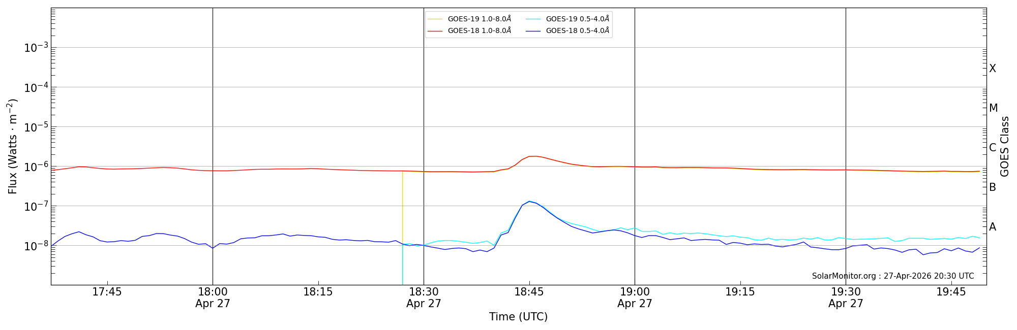 | 2026-04-27T18:37:00 | 18:46:00 | 18:50:00 | 15, 30 | 14420 | C1.7 | HEK : SSW Latest Events |
